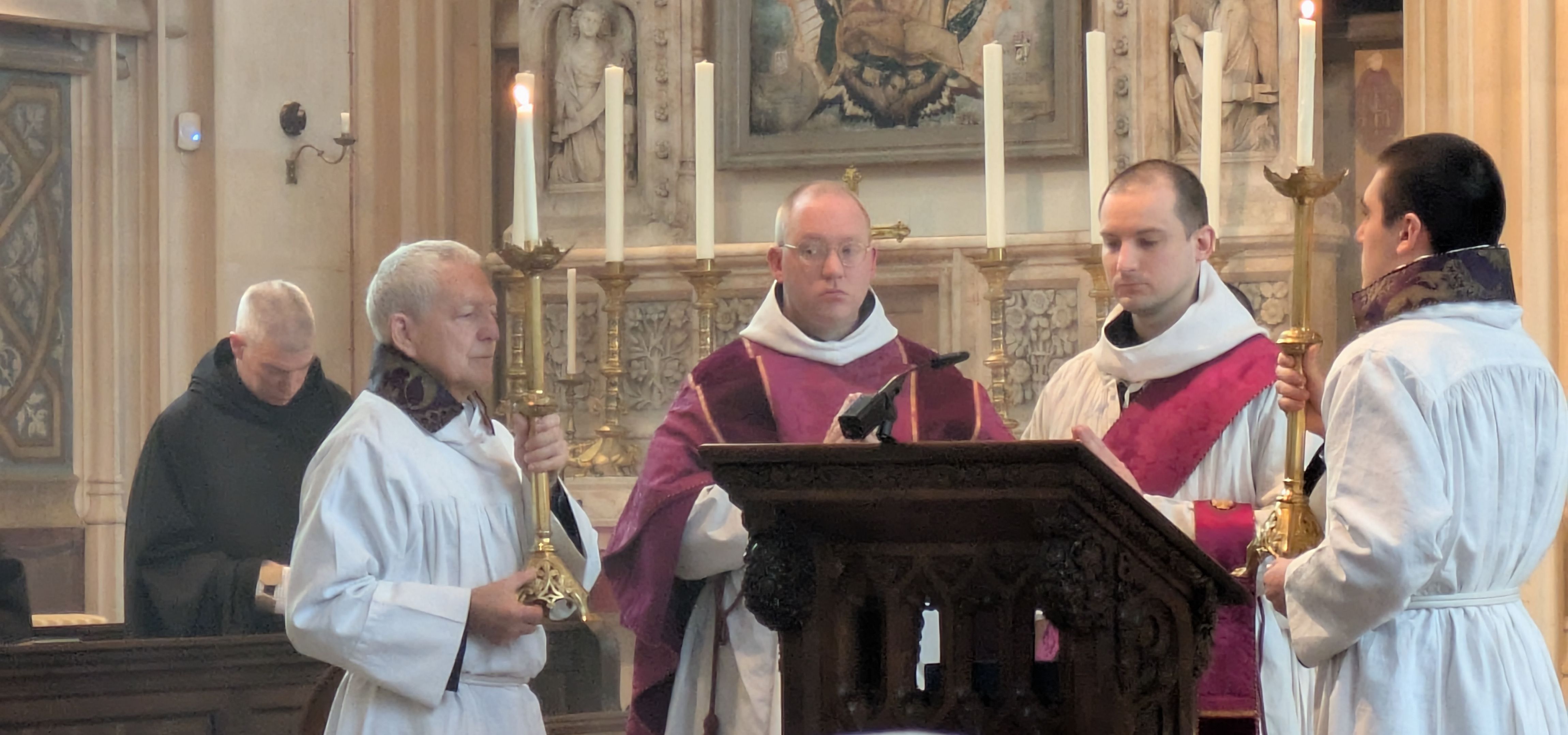 剛剛的主日是四旬期首主日,聖堂的管風琴暫停了,連禮儀服飾也改變了。守齋時期保留的傳統禮儀服「前摺祭袍」也回來了,大家可以回這裡重溫。下圖也見到站在後方的副執事身穿「前摺祭袍」,而宣讀福音的執事則脫下了「前摺祭袍」,只看到「寬執事肩帶」。「寬執事肩帶」是配合「前摺祭袍」所用,比其他時期的普通執事肩帶來得闊。